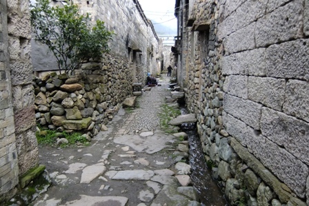 这个古村落有个特色景观: 街上有泉水沟渠流经每家每户,虽然有几处已经被损坏或污染.就象丽江古城那样.街面是弹格路,