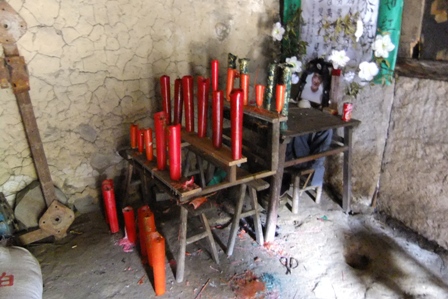 小汤的外公也在一堆破旧的老房子中间. 他在去年去世,现在家里无人居住, 门是没有上锁的,(这里的人家都不锁门).有一个小房间里供着外公的祭台, 像片前是阶梯式的烛台, 按规矩.出嫁的女儿和女婿的香烛是要供在上层的,而且还是绿色的.小汤外公有两个女儿,除了他母亲,还有一个妹妹.因此看到两付绿色香烛.在一堆废墟的瓦砾堆里,我们看到二个褐色夹砂陶的夜壶,其中一个很完整.但因为是夜壶,小汤看了看我., 我也看看他. 最后还是他开口问我要不要带上. 我表示同意.