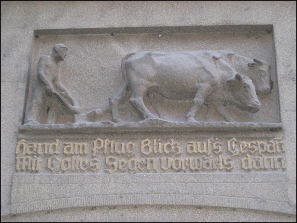 穿越黑森林的途中,我们会经过一些小山村, 很宁静,悠美, 很难看到人, 我们在一条很美的小溪边停下来,才在一个农具仓边看到一位老先生在修树枝. 女儿跟他聊得很热闹. 在一家乡村酒店喝啤酒时,我们看到墙上挂了一件农具一样的东西,但不知道是什么,店主只是比划了一下,也没让我们理解. 后来我们来到目的地镇上一个二手货市场,又在一堆杂货中看到了它. 一路上一共看到三次, 总算有一回在一条老街上走过时,看到墙头有一座浮雕,一位农夫扶犁耕作,而走在前头的两驾牛的脖子上,就套着这个东西. 这就是在中国被称作”轭”的农具. 我很喜欢,但太大,很不方便带回去. 于是又在二手货市场寻找当地民俗用品. 女儿看到了一个德国人手工制作的磨咖啡机. 盖子的上口放料的地方,有一个会转动的铁片,放好咖啡豆后转过来盖上,下部一个抽屉,用来盛咖啡粉末, 中心是一个用 蜗杆啮合原理形成挤压粉碎制成的主体机构.很能代表德国人在制作技能上的特色.于是把它带回来了. 我还淘到了一个德国秤坨, 和几张1945年的老照片 |