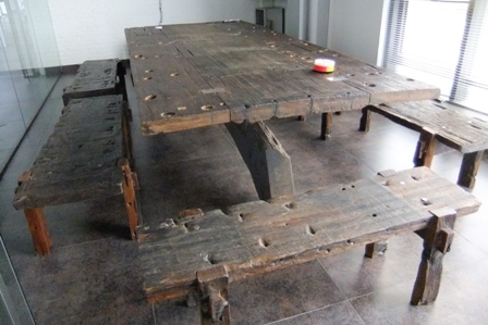 在朋友办公室看到一套非常有沧桑感的会议桌,木质极坚硬,表面好像浸透了油,黝黑乌亮, 自然地凹凸起伏,包浆光泽内敛。有的地方甚至还留有铁螺杆。一问知是海船上拆下的木料。 于是我也希望他能带我去那家拆船厂看看。 朋友说那个拆船厂老大脾气非常古怪,如果谁没有诚意,说话又牛比哄哄,他就不屌你,你也不用想再上门,如果谈得可以,他会非常客气大方。 这家拆船厂在温岭的海边,堆场上,旧船板堆得像小山高,每一根料都吃透了海水和机油,黑黝黝的。 老大在“山”上帮一个扎辫子的大胡子老外和他的中国胖老婆选木料,他们想在厦门开一家饭店,用船板做桌椅。 我朋友在“山”下给老大打招呼,老大只是“嗯”了一下。几乎是没搭理。我领教了这个家伙的古怪。 我们在一边找中意的料,也没去打搅老大。这时,我在一堆杂物中间,发现一个铁疙瘩,类试仪器,仔细一看,我感觉到应该是