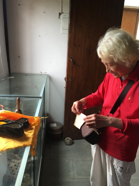 6月18日,多次从媒体报道了解山塘苑的原文教局梅诚老师夫妇,前天终于联系到苑主,夫妇俩坐公交来到本苑,在苑主陪同下参观藏品。梅老师还带来了她老母的一双三寸金莲布鞋,和一件自己收藏的铜质摇铃,介绍了来历,并捐给了本苑。