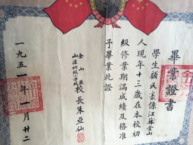 〉〉理事裴军了解到高凤琴会长小学毕业于张堰山泾小学,特将一份收藏的50年代原山泾小学的毕业证书原件,赠送给高。 姚连根老师看了证书后称:他认识这位校长朱亚仙和这位学生顾民豪的兄长。 ![]()