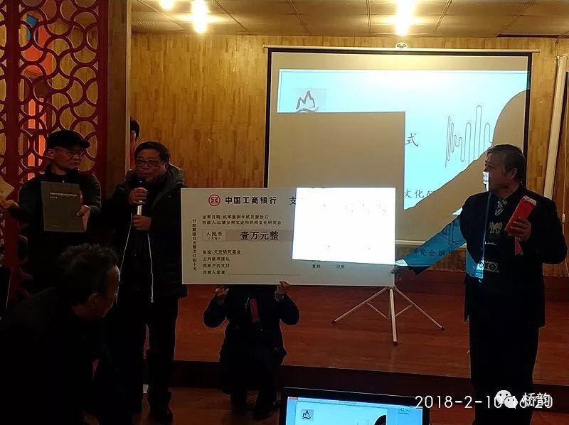以下为年会上获奖名单: 年度人物:梁向东,缪时方,蒋仁龙,张青云,王超,张更生,蒋志明。 年度成果:王浩权,黄建平,姚天云,蒋顺荣。 年度创意:裴军,陈永辉。 论坛报告人:高渠(台湾),蒋志明,黄建平,唐秀芳,张更生,蒋仁龙,沈斌,周勤华。 【第三板块:捐款仪式】 史官云老师出于对家乡的文史研究和山塘文史研究会的关心,特在年会上向研究会捐款,他希望帮助研究会将家乡文史资料的收集和编辑工作开展得更加顺利。