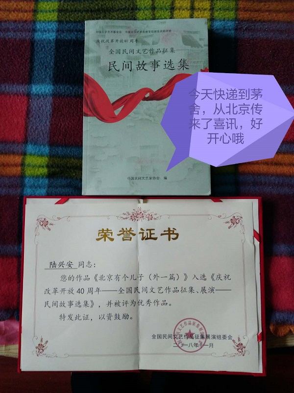 会员陆兴安老师的故事作品《北京有个儿子》,被评为“庆祝改革开放40周年全国民间文艺作品”优秀奖,并获颁证书,作品选入《全国民间文艺作品--民间故事选集》