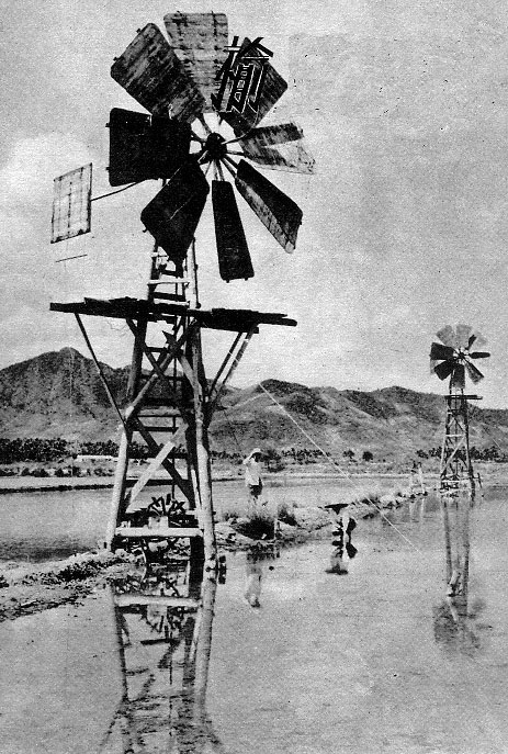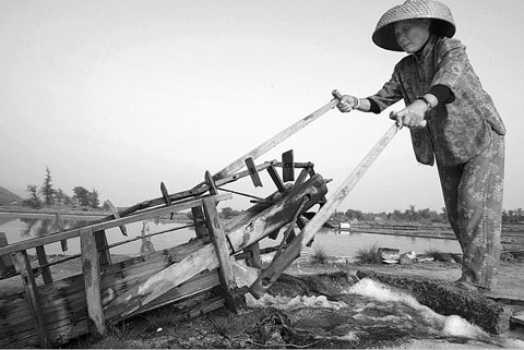 以前用风车戽盐水,现在用水泵。