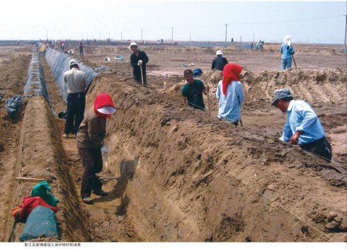 盐滩建成后,还要整滩。将池内泥土挖松,晾干,再放入海水泡稀,盐工赤脚在池内将池踩匀,用刮板刮平底池,然后将池内海水排出晾干,用光礅(石制,粗大圆柱形石头)压实压平。