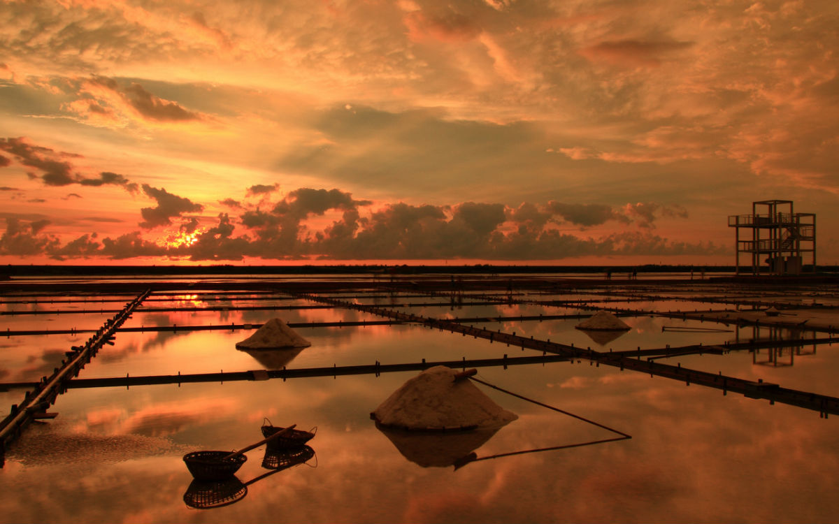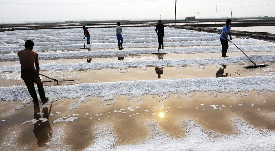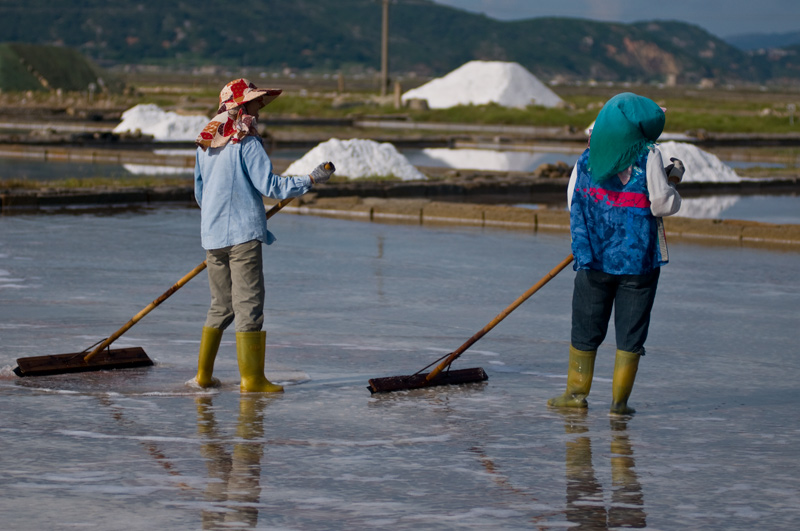 海水引入滩池后,等天气一晴,就开始作业。海水在不同的蒸发池(每块约20多平米,四边用泥把盐水围起-池埂)中摊晒,使水份不断蒸发,盐浓度不断上升,然后再换到另一块打理得更平坦(一般用深色碎瓷片铺设)的盐田(结晶池),一直到浓度达到27度后成饱和溶液后,再转移到一块铺有黑色塑料薄膜的很平整的平地盐田上,让高浓度盐析出盐晶,清除表面杂质,即可