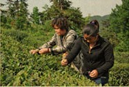 【中图】:本馆工作人员黄姐在天台山华顶云雾茶茶场与茶农一起采茶